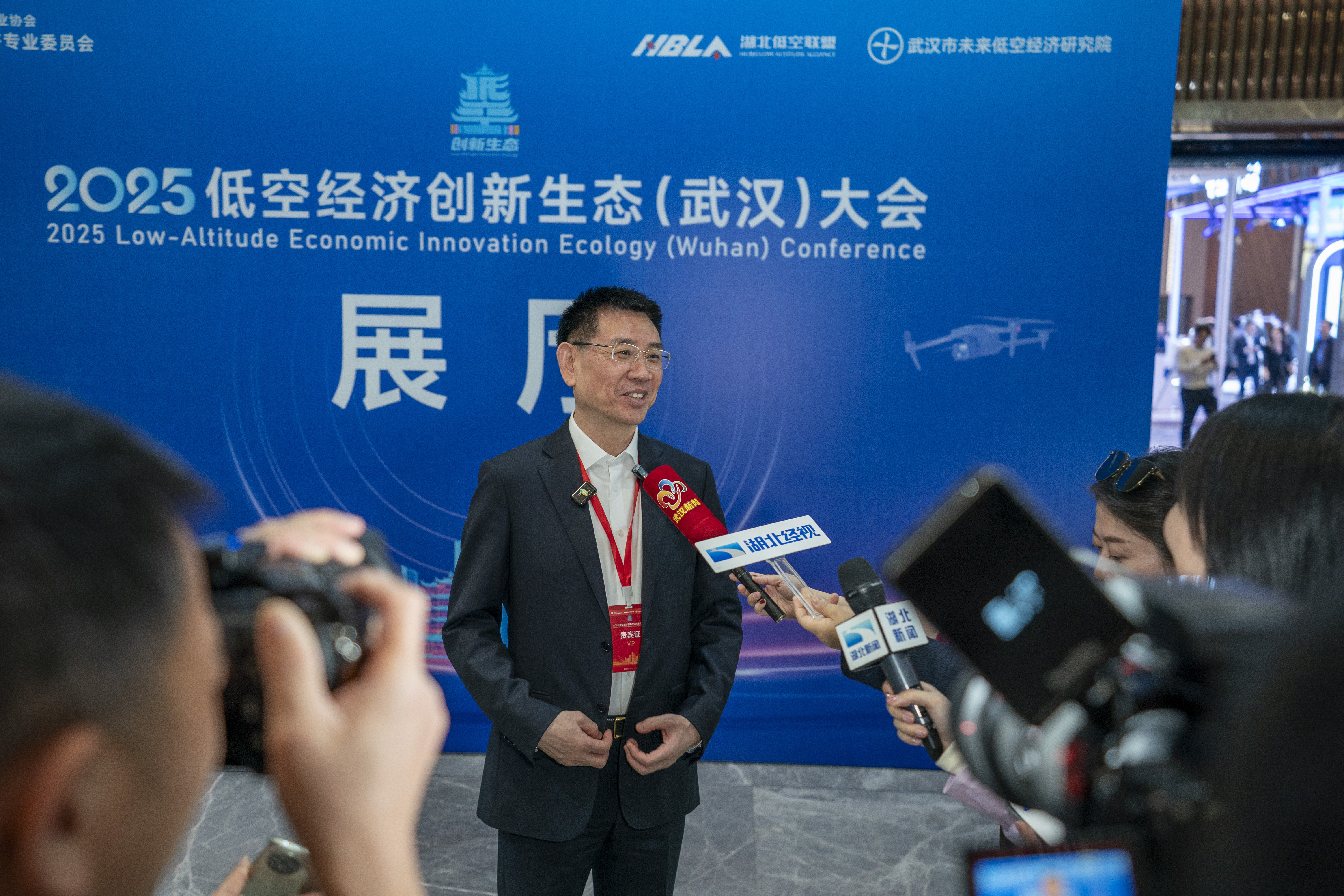 黄立在2025低空经济创新生态(武汉)大会上接受各个媒体采访。(湖北日报全媒记者 魏铼 摄)
