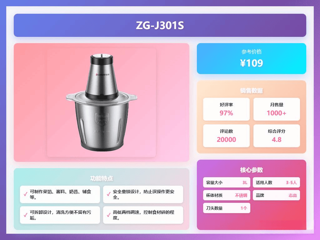此外,这款机器还具备三档调速功能,能够准确的通过不同食材的需求来做调整,操作更为专业。安全设计方面,它配备了即停盖子和提手,用起来让人倍感安心,清洗也十分便捷,适合家庭日常使用。